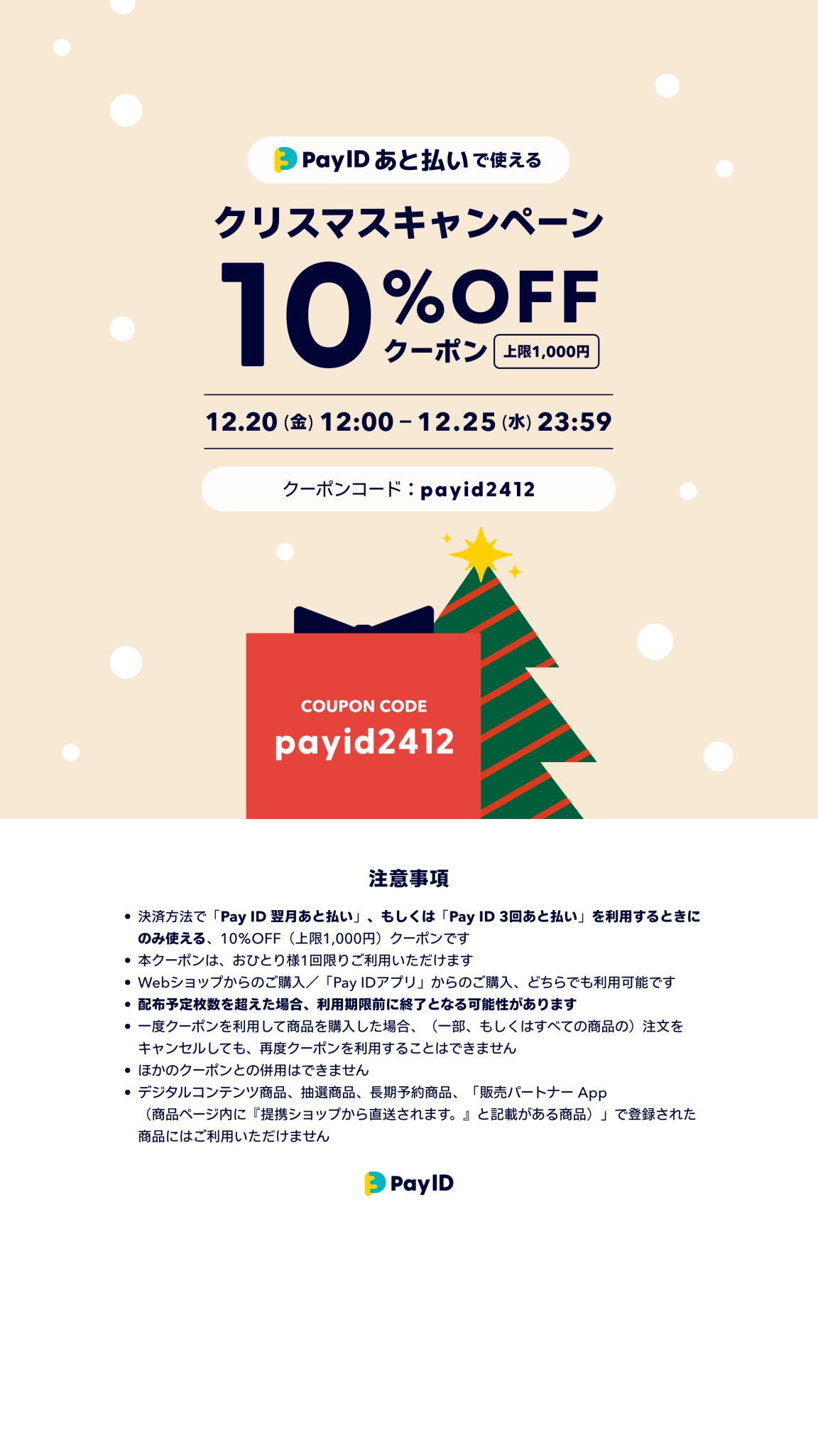 【「Pay ID あと払い」限定】クリスマスクーポンコードで10%OFFキャンペーン始まります!